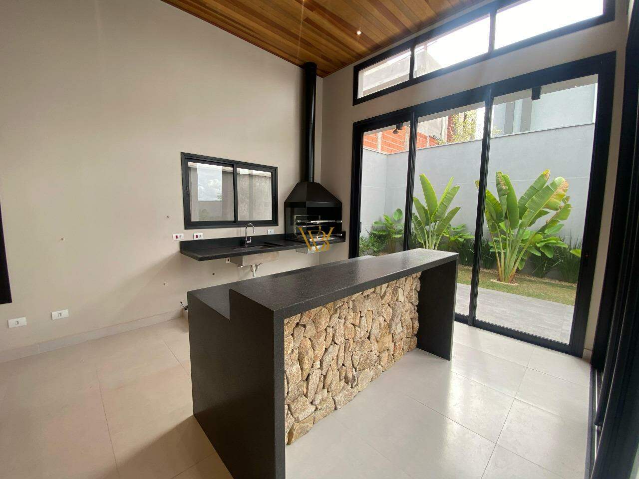 Projeto integrado, com área gourmet com churrasqueira e bancadas em pedras naturais.